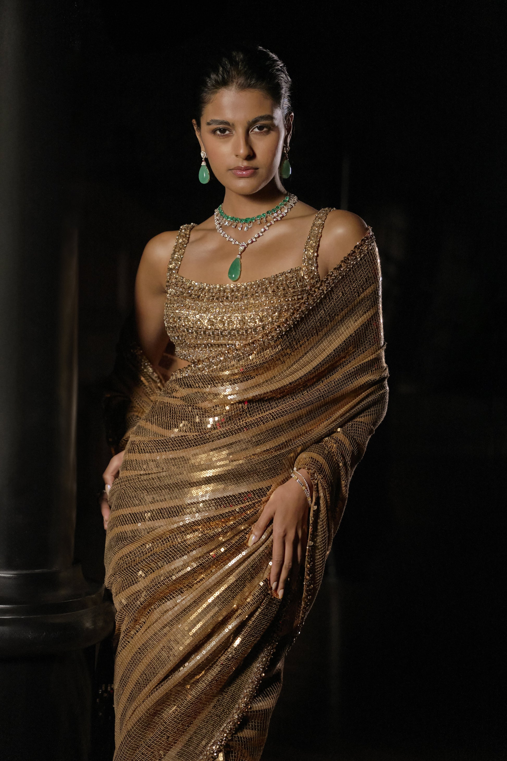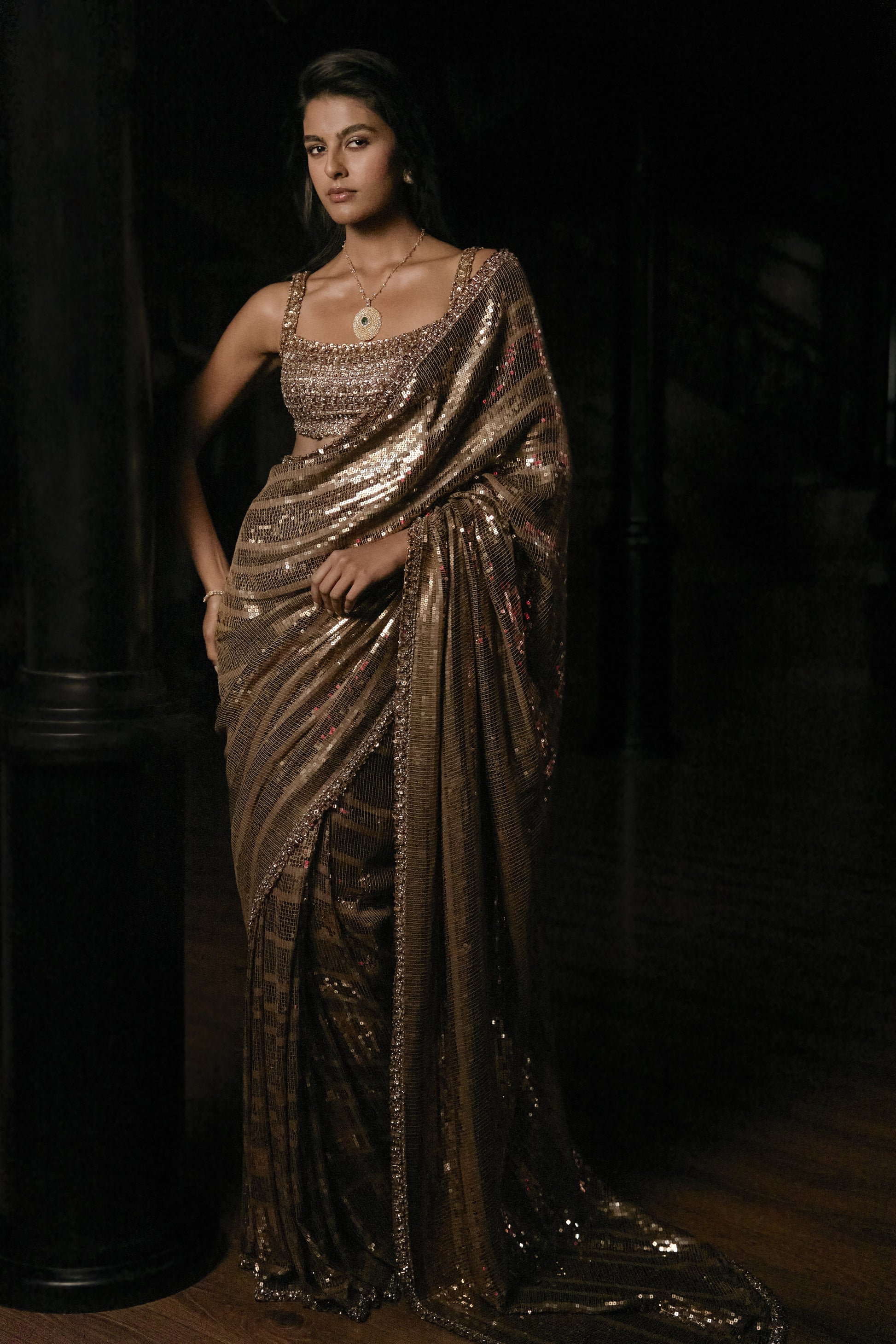 This antique gold saree features all over assorted sequin work in a linear pattern. It is paired with an embroidered sleeveless blouse. The saree has a matching crystal border.