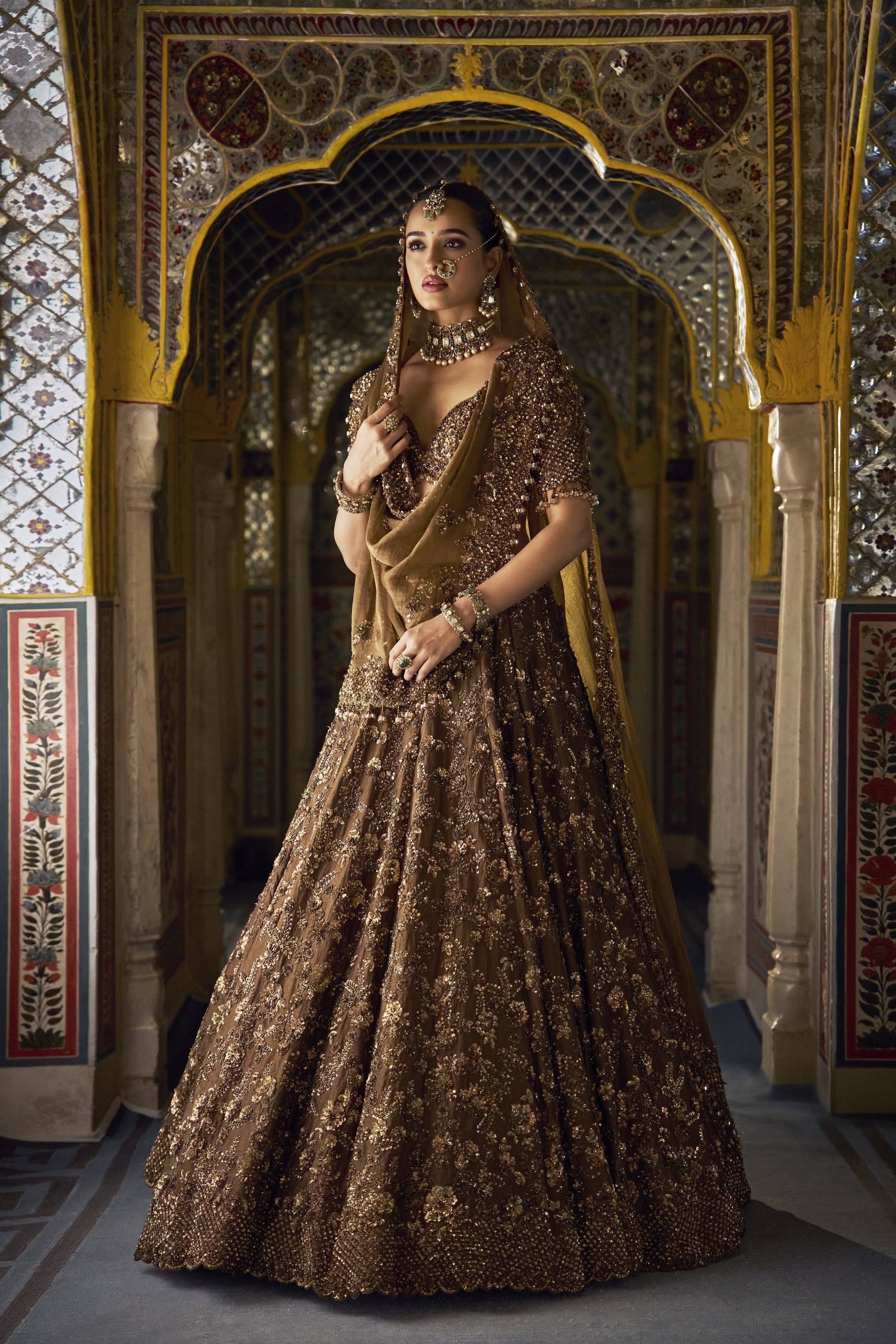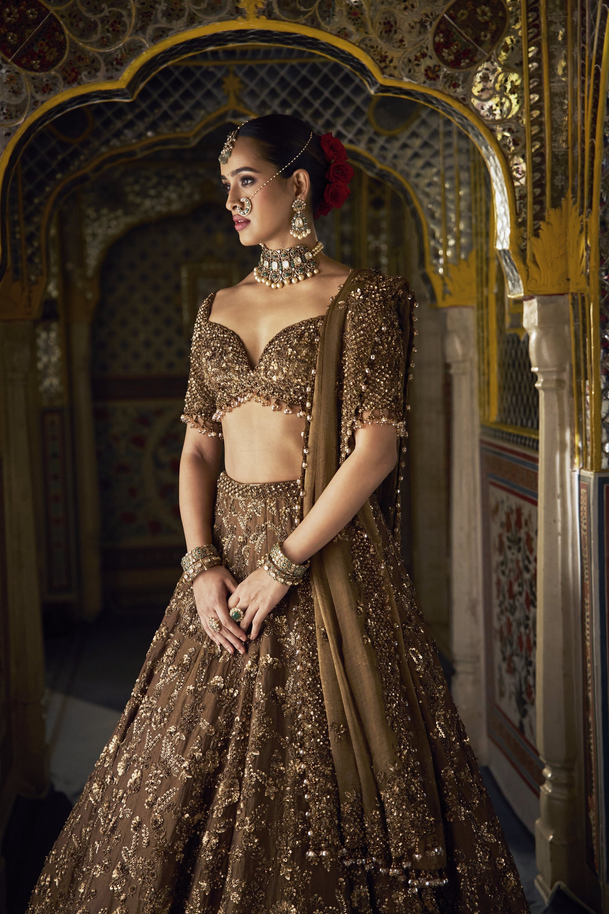 This lehenga set features intricate embroidery in bronze tones on a matching tissue silk base. The elbow sleeve blouse has tassels at sleeve hem and is paired with an embroidered tissue organza dupatta with exggarated tassels on all four sides.