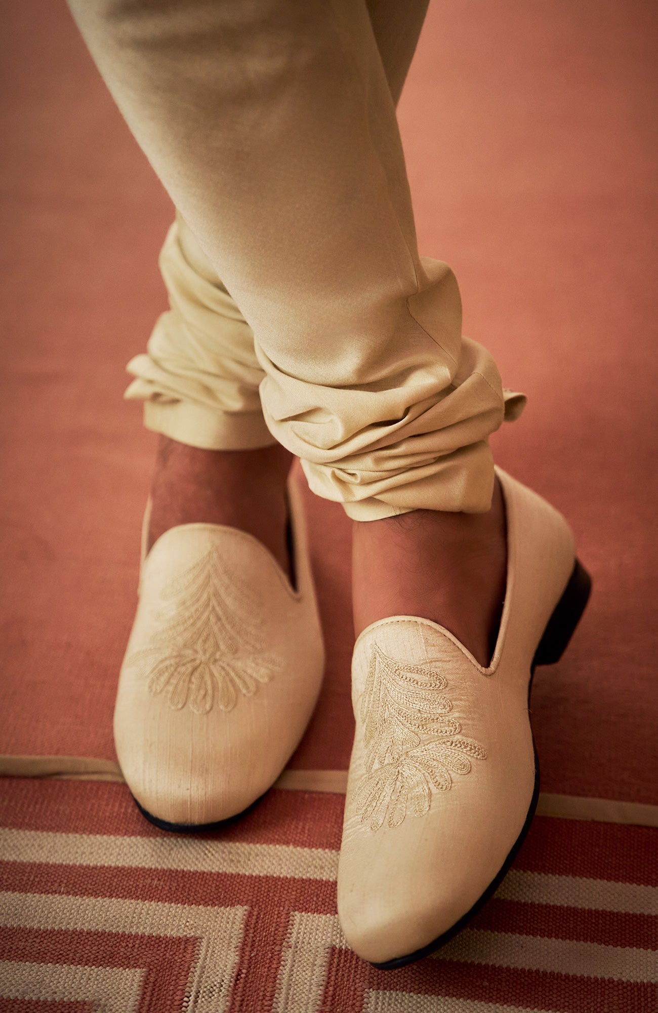This set features thread embroidery in tones of ivory and gold on a champagne raw silk base. The ensemble is paired with a matching textured silk kurta and churidar. The organza dupatta has a matching embroidered border on all four sides. Complementing stole and footwear are also available.