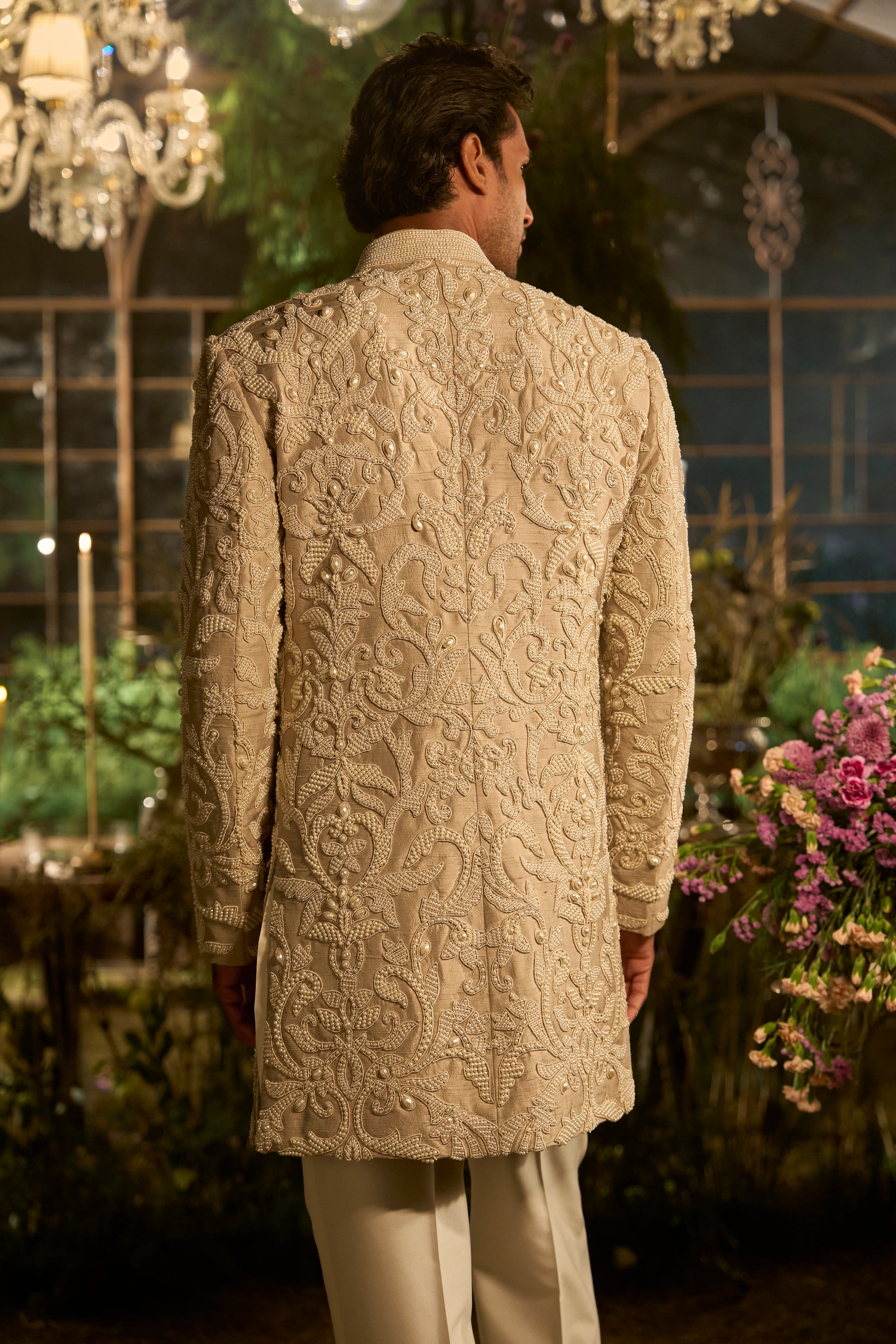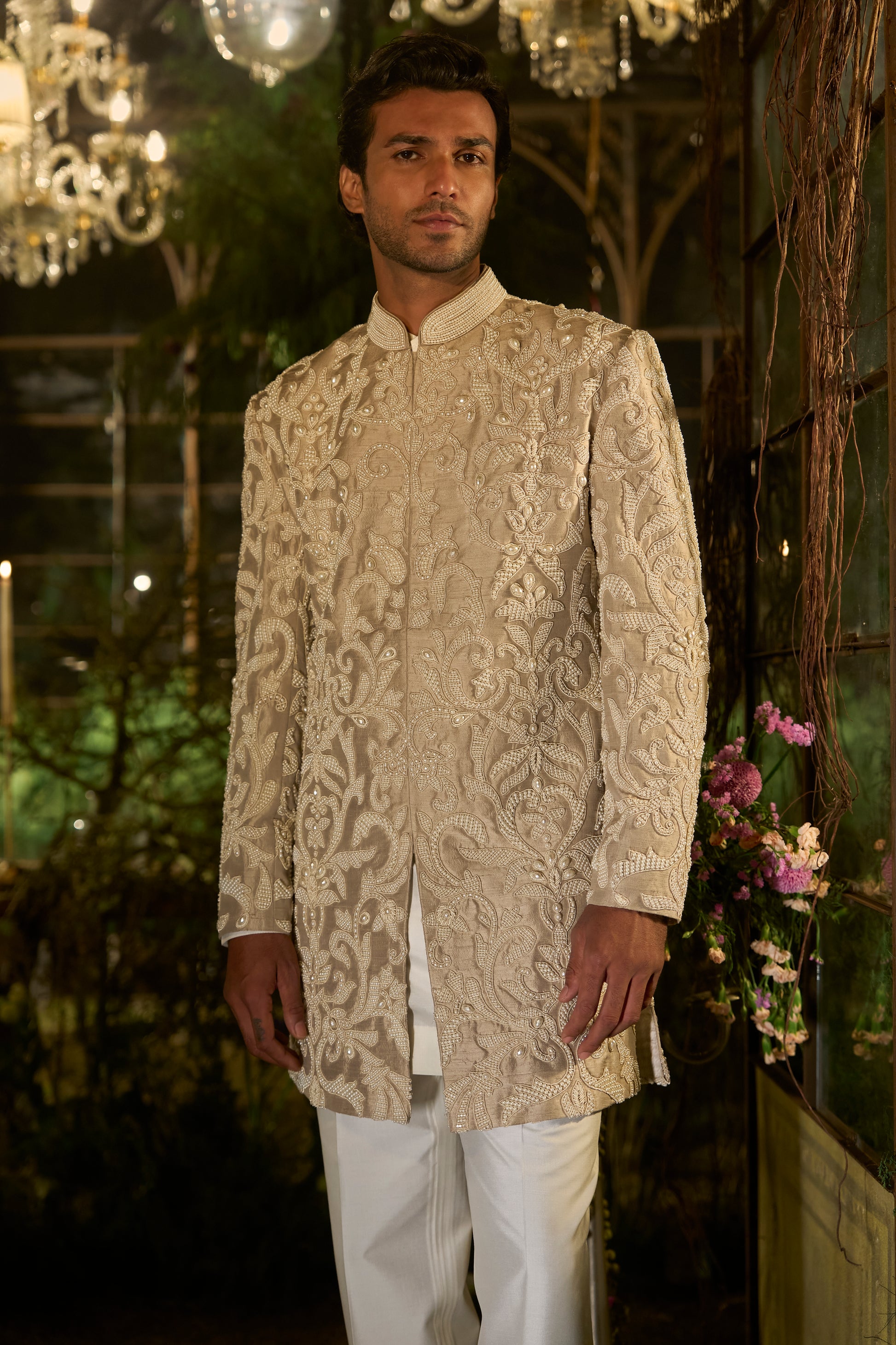 This sherwani set features pearl embroidery with bold metallic dori outline on a champagne tissue silk base. It is paired with an ivory silk kurta and matching straight pants.