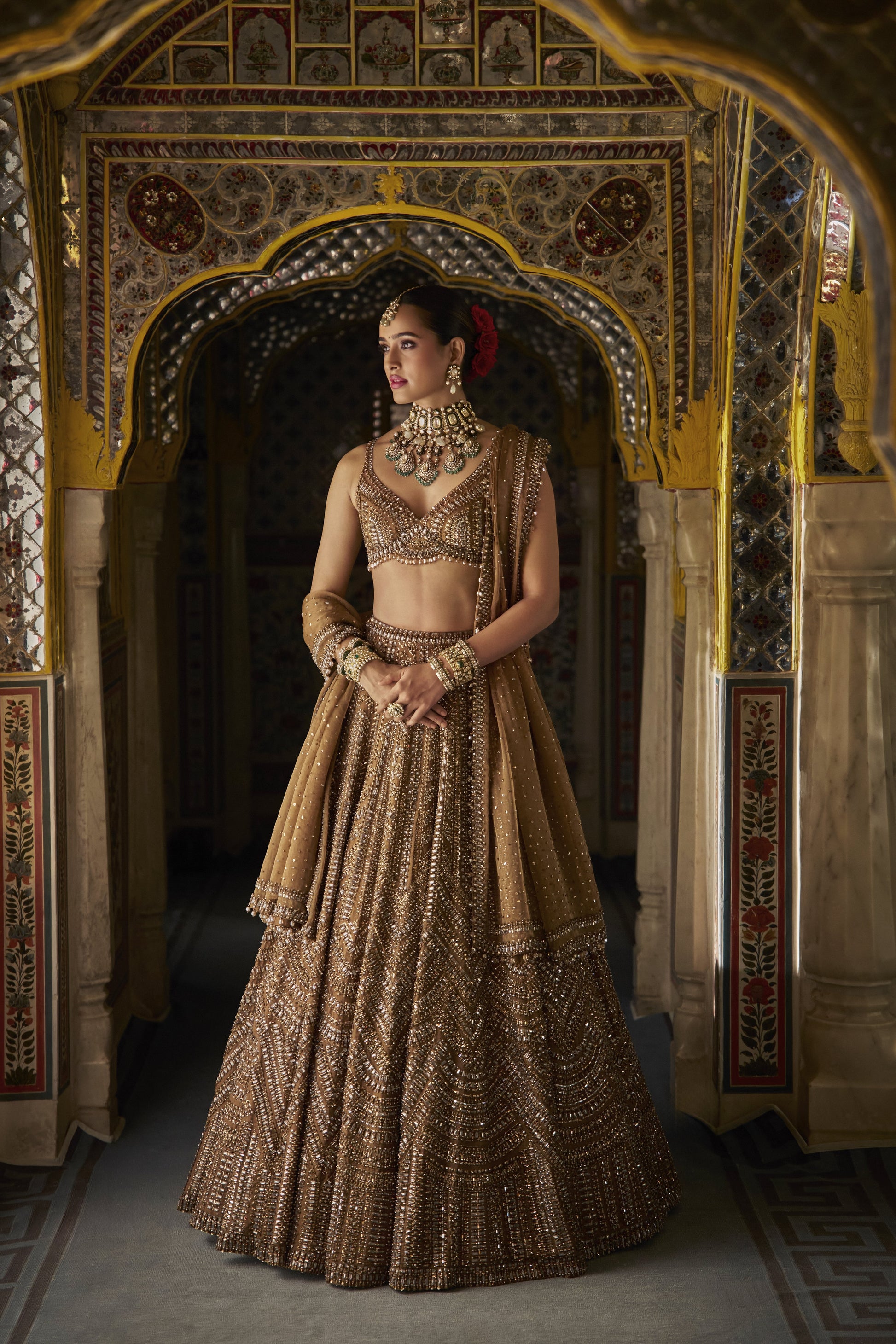 This lehenga set features intricate embroidery in copper and gold crystal in a geometric pattern on a tissue silk base. The embroidered sleeveless blouse has a criss cross back and shows delicate tassels at the blouse waist. It is paired with an embroidered tissue organza dupatta with delicate tassels on all four sides.