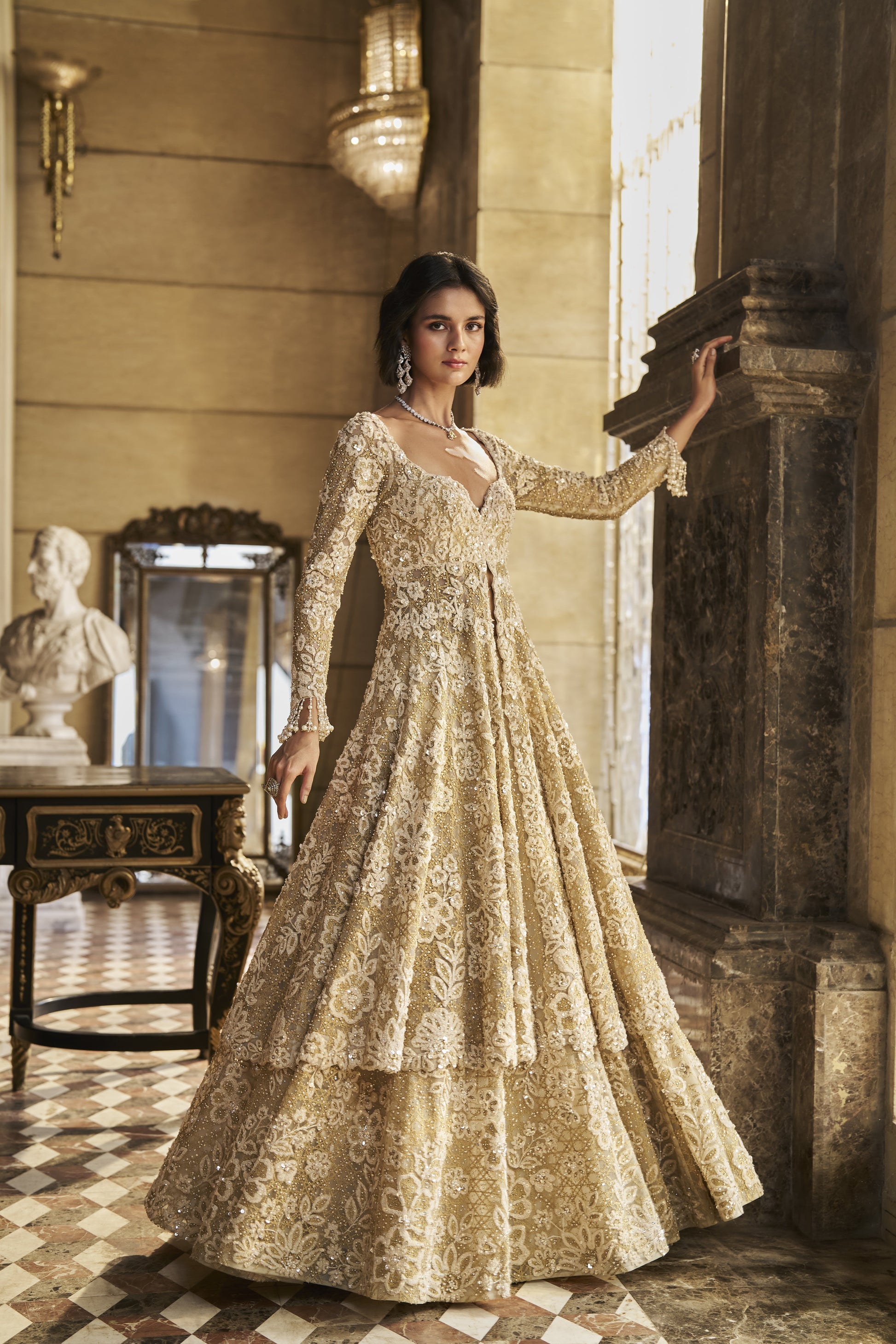 This jacket lehenga set features intricate thread embroidery interspersed with delicate pearl and sequin work on a cream net base. The full sleeve jacket shows pearl tassels at sleeve hem and is paired with matching embroidered lehenga. The scalloped dupatta shows pearl drops on all four sides.