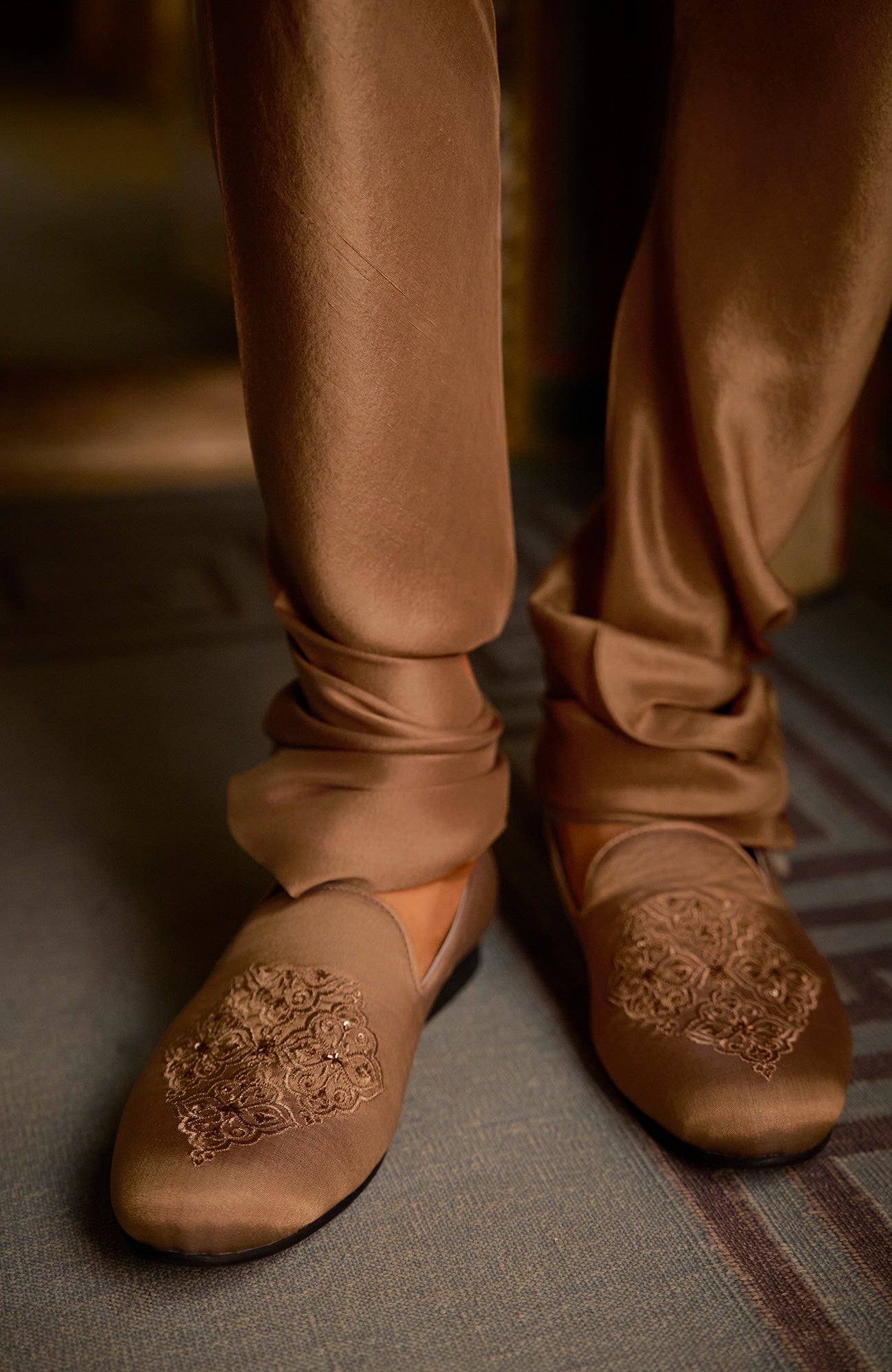 This set features all over antique gold metallic thread embroidery further highlighted in delicate tonal zardosi. This tissue silk sherwani paired with a matching textured silk kurta and churidar. Complementing footwear is also available.