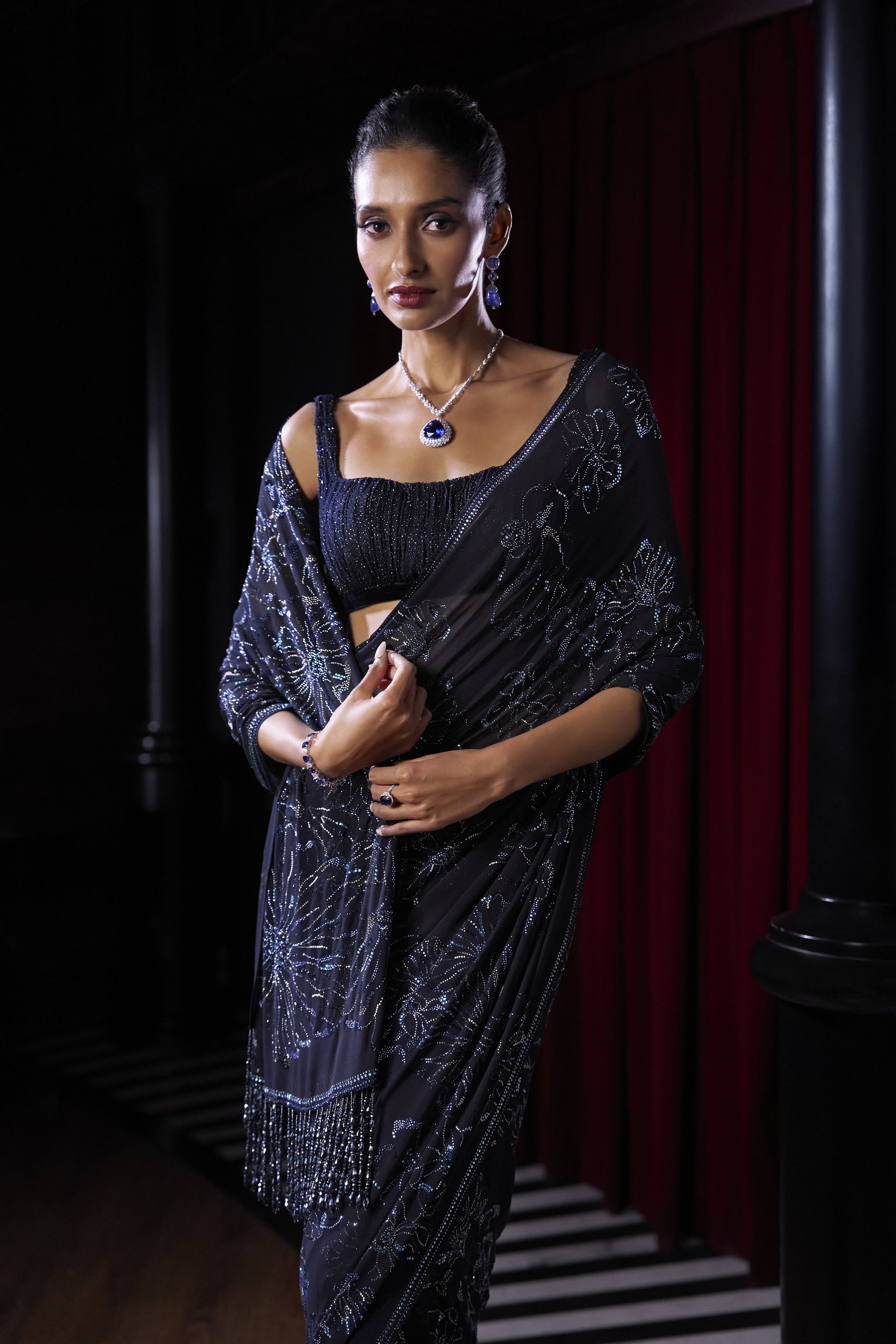 This midnight blue georgette saree features delicate crystal embroidery in a floral pattern. The saree has an exaggerated crystal tassels. It is paired with sleeveless draped sculpted blouse.