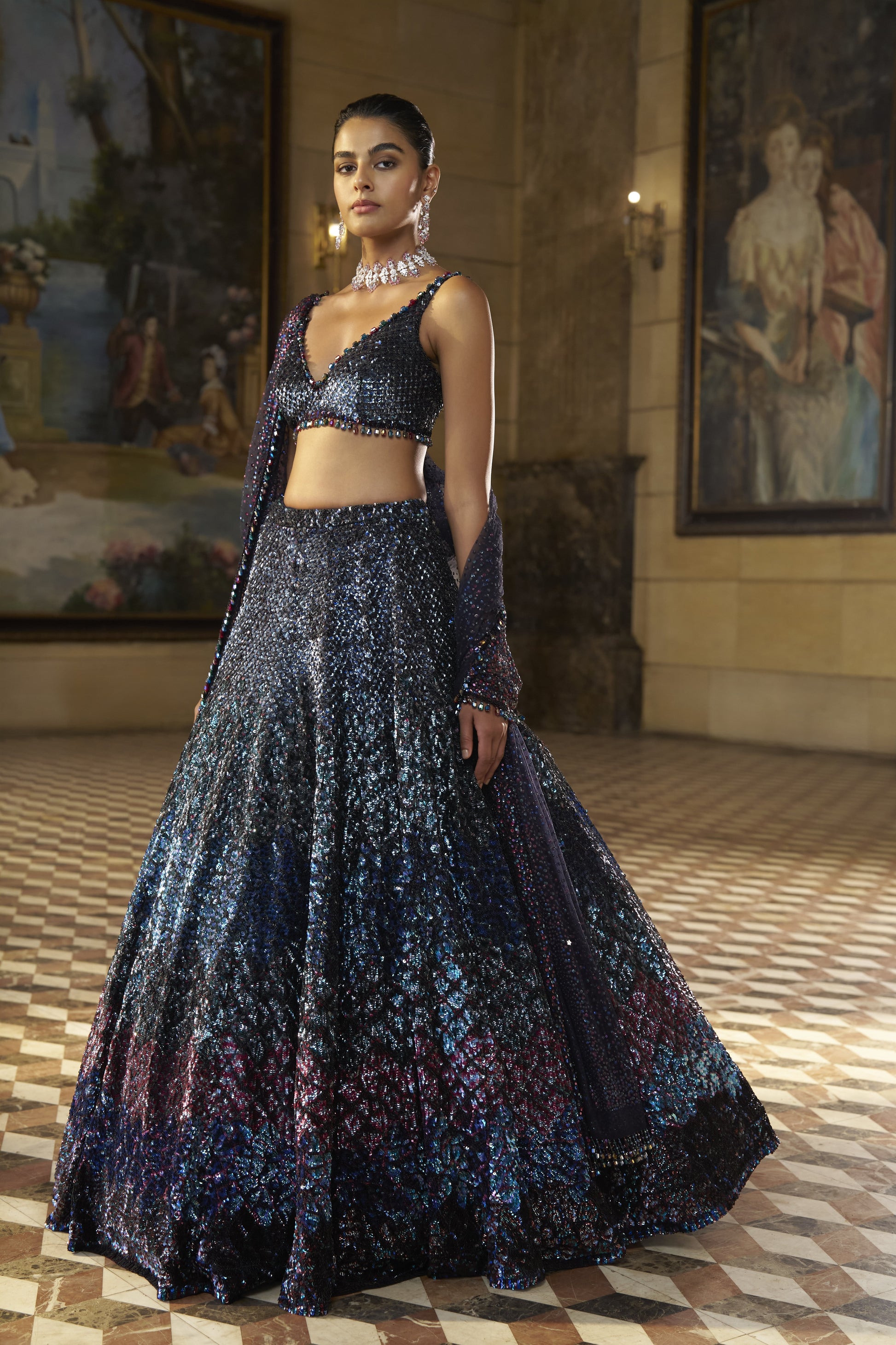 This sequin lehenga set features embroidery in jewel tones in an ombre pattern. The ensemble is paired with a sleeveless blouse with tassels at the waist and a matching net dupatta.
