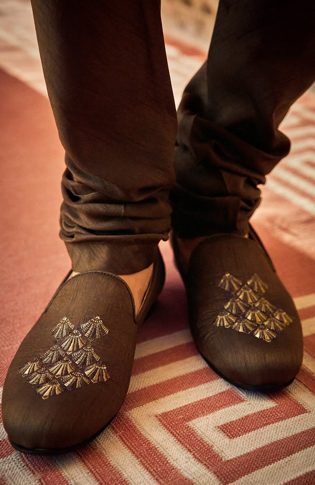 This sherwani set features all over thread work highlighted with french knots and delicate sequin in a geometric pattern on a textured silk base. The ensemble is paired with a matching textured silk kurta and churidar. Complementing footwear is also available.