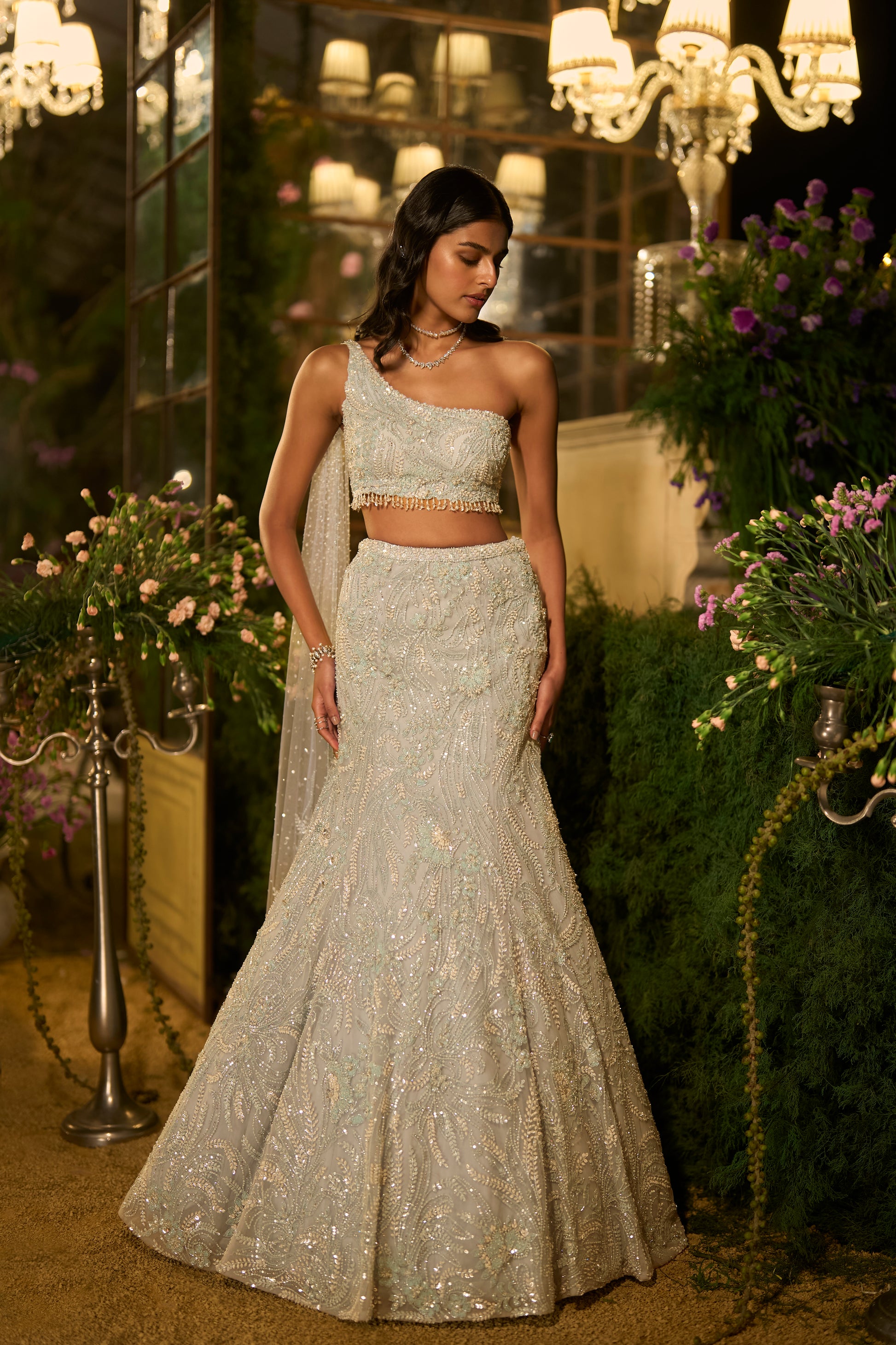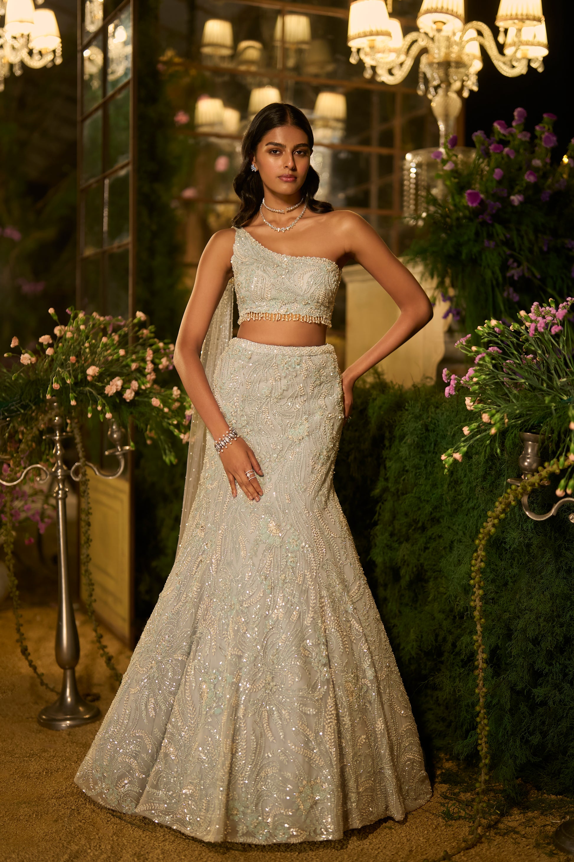 The skirt set features combination of delicate abstract pattern embellished with sequins and beads embroidery. The one shoulder fully embroidered blouse is adorned with tassel detailing at the waist and comes with an attached shoulder dupatta.