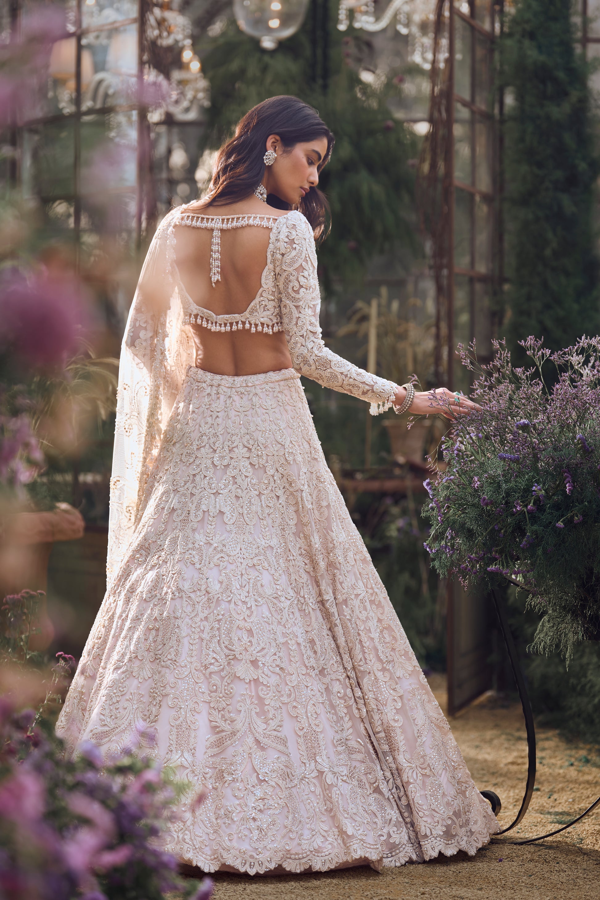 This lehenga set features embroidery in powder peach thread, sequins and pearls. The full sleeves blouse features a beaded detail at the neckline, waist and wrist. It is paired with four sided embroidered net dupatta.