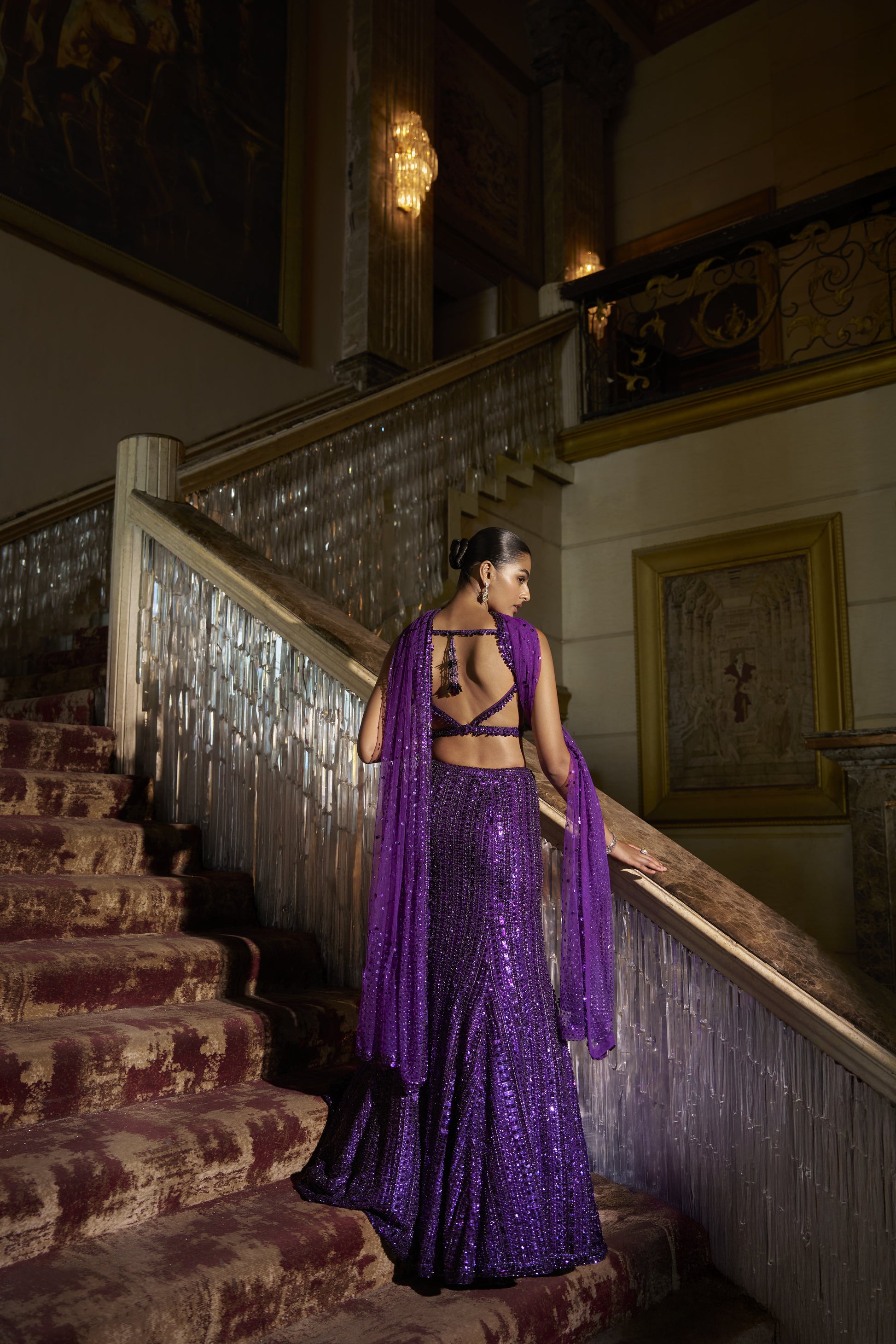 This skirt set features tonal sequin embroidery on a purple net base. The blouse has side cut outs along with the delicate tassels at the waist. The ensemble is paired with a matching dupatta with delicate tassels on all four sides.