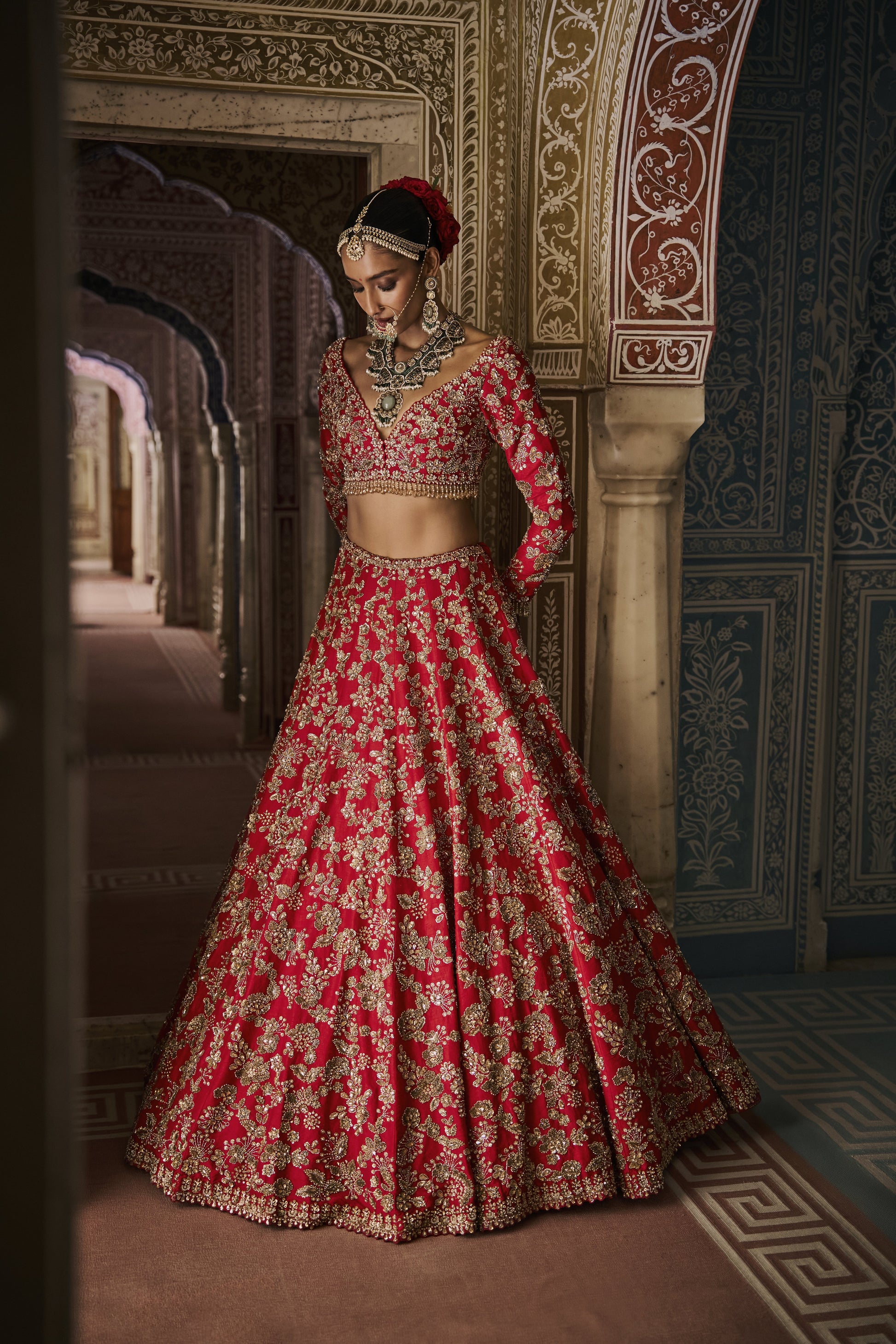 This lehenga set features intricate embroidery in gold crystals, sequins and bugle beads on a raw silk base. The full sleeves blouse shows a plunging neckline and delicate crystal tassels at the sleeve hem and waist. The ensemble is paired with an embroidered dupatta with tassels on all four sides.