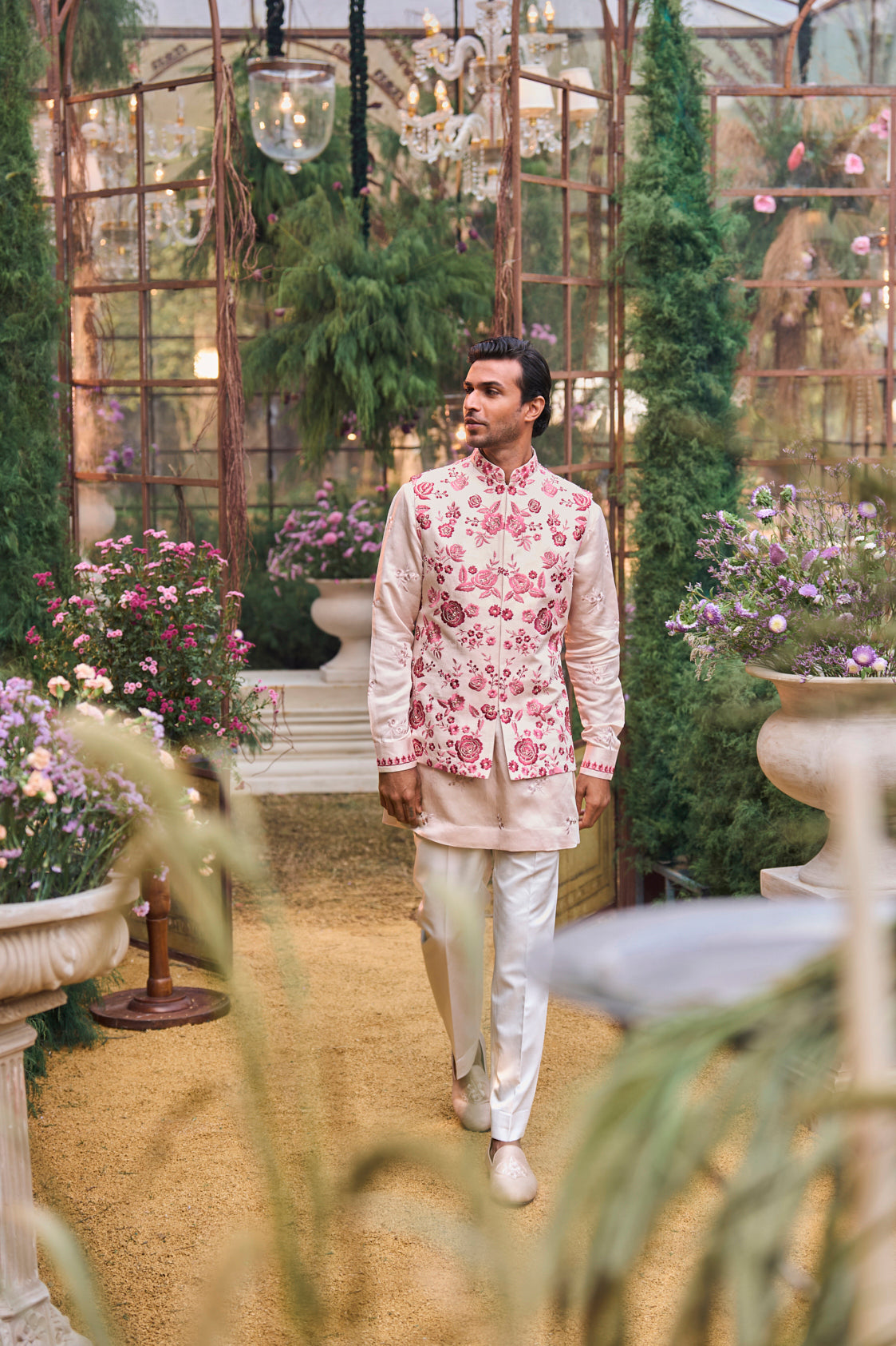 This bundi set features thread work embroidery in ruby tones on a raw silk base. It is further highlighted with delicate bugle beads and sequin. The ensemble is paired with a matching embroidered kurta and ivory straight pants.